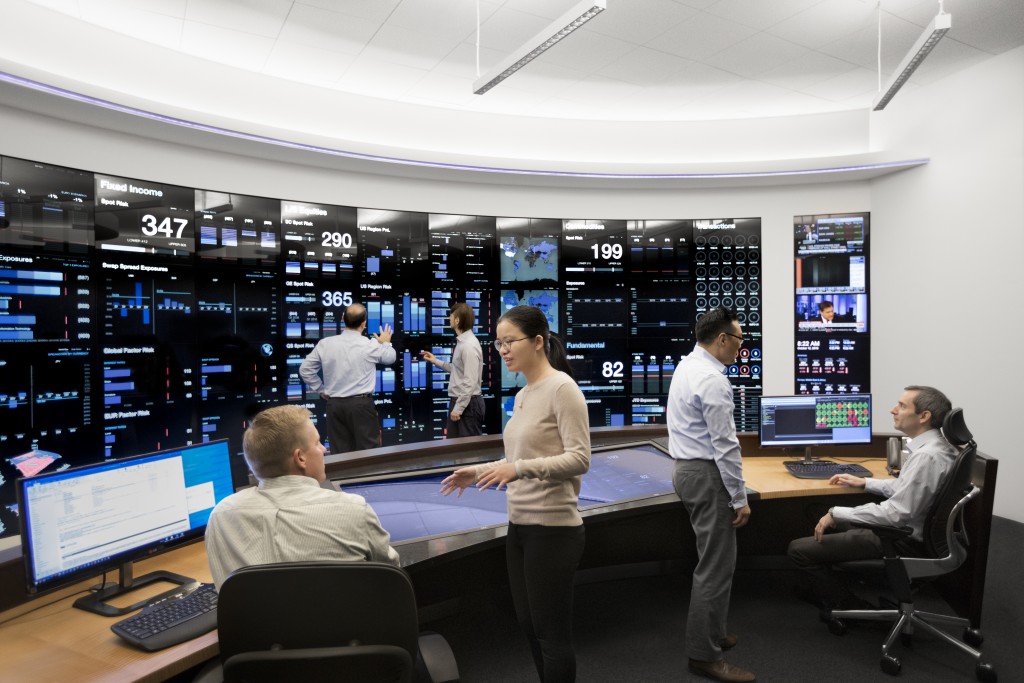 Royal Trades Risk Management Center provides a comprehensive view of the various investment portfolios and how they fit within pre-established guidelines. Built in 2014, its front-end consists of a 27' by 8' interactive touchscreen designed to visualize data in ways that allow for rapid comprehension. Its back-end systems, which connect to every Febull Trades office worldwide, continuously run a wide range of operational readiness, risk, and stress test monitors.